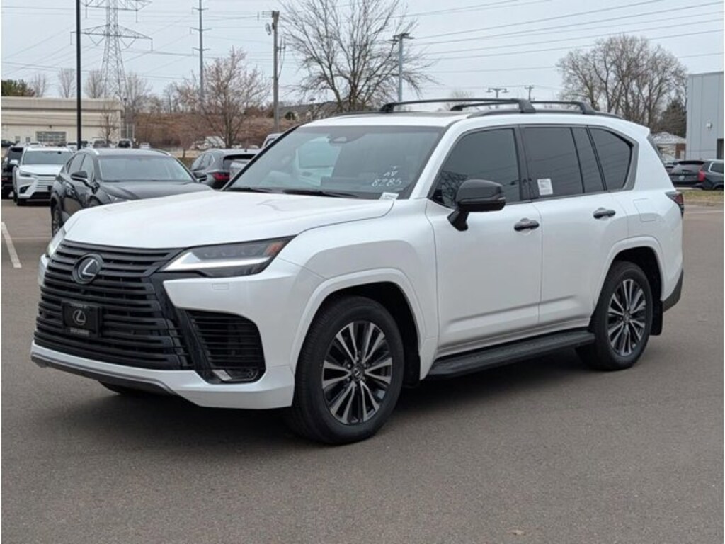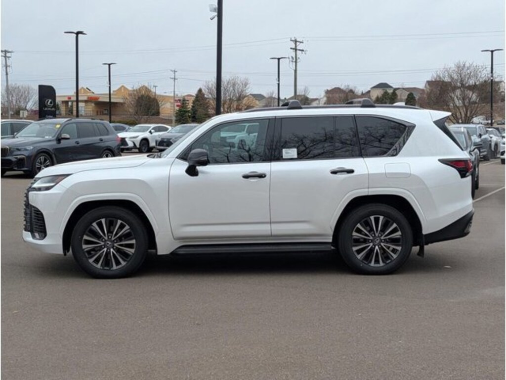 This LX is well equipped with Accessory Package, Appearance Package (Black Chrome Bumper Trim, Black Chrome Window Trim, Black Door Handles, Black Outside Mirrors, Dark Gray Roof Rails, and Matte Gray Grille), Interior Upgrade Package (Driver's and Passenger's Seat with Multifunction Massager, Semi-Aniline Leather Seat Trim, and Ventilated 2nd-Row Outboard Seats), Black Semi Anil Leather, 10 Speakers, 20 Wheels, 3rd row seats: split-bench, 4-Wheel Disc Brakes, ABS brakes, Adaptive suspension, Air Conditioning, All-Weather Cargo Mat (3-Row Suv), All-Weather Floor Liners - Off Road (3-Row SUV), Alloy wheels, AM/FM radio: SiriusXM, Apple CarPlay/Android Auto, Auto High-beam Headlights, Auto tilt-away steering wheel, Auto-dimming door mirrors, Auto-dimming Rear-View mirror, Auto-leveling suspension, Automatic temperature control, Black Emblem Overlays, Brake assist, Bumpers: body-color, Compass, Cross Bars, Delay-off headlights, Driver door bin, Driver vanity mirror, Dual front impact airbags, Dual front side impact airbags, Electronic Stability Control, Emergency communication system: Safety Connect (5-year minimum), Exterior Parking Camera Rear, Front anti-roll bar, Front Bucket Seats, Front Center Armrest, Front dual zone A/C, Front fog lights, Front reading lights, Front wheel independent suspension, Fully automatic headlights, Garage door transmitter: HomeLink, Genuine wood console insert, Genuine wood door panel insert, Headlight cleaning, Heads-Up Display, Heated and Ventilated Front Seats, Heated door mirrors, Heated front seats, Heated rear seats, Heated steering wheel, Illuminated entry, Leather Seat Trim, Leather Shift Knob, Leather steering wheel, Lexus Interface with 12.3 Touchscreen Display, Low tire pressure warning, Mark Levinson 25-Speaker Reference Surround Sound, Memory seat, Navigation System, Occupant sensing airbag, Outside temperature display, Overhead airbag, Overhead console, Panic alarm, Passenger door bin, Passenger vanity mirror, Power door mirrors, Power driver seat, Power Liftgate, Power moonroof, Power passenger seat, Power steering, Power windows, Radio data system, Radio: Lexus 10-Speaker Premium Sound System, Rain sensing wipers, Rear air conditioning, Rear dual zone A/C, Rear reading lights, Rear seat center armrest, Rear side impact airbag, Rear window defroster, Rear window wiper, Reclining 3rd row seat, Remote keyless entry, Security system, Side Puddle Lamp, Speed control, Speed-sensing steering, Split folding rear seat, Spoiler, Steering wheel memory, Steering wheel mounted audio controls, Tachometer, Telescoping steering wheel, Tilt steering wheel, Traction control, Trip computer, Turn signal indicator mirrors, Variably intermittent wipers, Ventilated front seats, Voltmeter, and Wheels: 20 Alloy with Machined Finish.