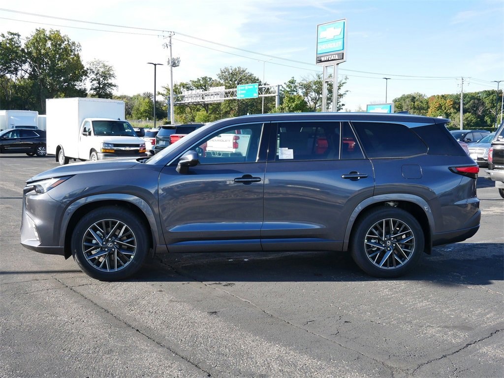 This TX is well equipped with Accessory Package (2T) (All-Weather Cargo Mat and All-Weather Floor Liners), Convenience Package (Digital Key, Front Cross-Traffic Alert & Lane Change Assist, and Traffic Jam Assist), 12 Speakers, 3rd row seats: split-bench, 4-Wheel Disc Brakes, ABS brakes, Air Conditioning, Alloy Wheel Locks w/Triple Nickel Chrome Plating, Alloy wheels, AM/FM radio, Apple CarPlay/Android Auto, Auto High-beam Headlights, Auto tilt-away steering wheel, Auto-dimming door mirrors, Auto-dimming Rear-View mirror, Automatic temperature control, Ball Mount, Brake assist, Bumpers: body-color, Delay-off headlights, Door Edge Film by 3M, Driver door bin, Driver vanity mirror, Dual front impact airbags, Dual front side impact airbags, Electronic Stability Control, Emergency communication system: Safety Connect (5-year minimum), Exterior Parking Camera Rear, Four wheel independent suspension, Front & Rear Mudguards, Front anti-roll bar, Front Bucket Seats, Front Center Armrest, Front dual zone A/C, Front fog lights, Front reading lights, Fully automatic headlights, Garage door transmitter: HomeLink, Heated door mirrors, Heated front seats, Heated steering wheel, Illuminated entry, Key Gloves w/Embossed Lexus Logo, Knee airbag, Leather Shift Knob, Leather steering wheel, Lexus Interface w/14 Touchscreen Display, Low tire pressure warning, Navigation system: Drive Connect Cloud Navigation (3-year trial subscription included), NuLuxe Seat Trim, Occupant sensing airbag, Outside temperature display, Overhead airbag, Panic alarm, Passenger door bin, Passenger vanity mirror, Power door mirrors, Power driver seat, Power Liftgate, Power passenger seat, Power steering, Power windows, Radio data system, Radio: 12-Speaker Lexus Premium Sound System, Rain sensing wipers, Rear air conditioning, Rear anti-roll bar, Rear reading lights, Rear window defroster, Rear window wiper, Reclining 3rd row seat, Remote keyless entry, Security system, Speed control, Speed-sensing steering, Split folding rear seat, Spoiler, Steering wheel mounted audio controls, Tachometer, Telescoping steering wheel, Tilt steering wheel, Tow Hitch Receiver, Traction control, Trip computer, Turn signal indicator mirrors, and Variably intermittent wipers.