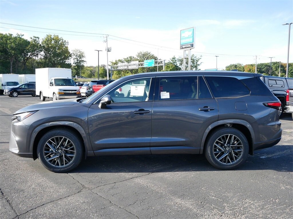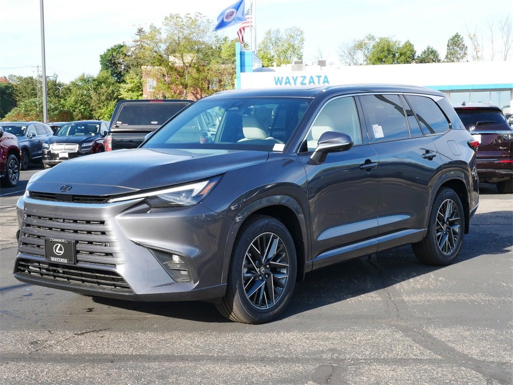 This TX is well equipped with Accessory Package (2T) (All-Weather Cargo Mat and All-Weather Floor Liners), Birch Interior Package, Convenience Package (Digital Key, Front Cross-Traffic Alert & Lane Change Assist, and Traffic Jam Assist), Technology Package (Advanced Park w/Remote Park and Panoramic View Monitor), 12 Speakers, 20 Wheels, 3rd row seats: split-bench, 4-Wheel Disc Brakes, ABS brakes, Air Conditioning, Alloy Wheel Locks w/Triple Nickel Chrome Plating, Alloy wheels, AM/FM radio, Apple CarPlay/Android Auto, Auto High-beam Headlights, Auto tilt-away steering wheel, Auto-dimming door mirrors, Auto-dimming Rear-View mirror, Automatic temperature control, Ball Mount, Black Emblem Overlays, Brake assist, Bumpers: body-color, Delay-off headlights, Door Edge Film by 3M, Driver door bin, Driver vanity mirror, Dual front impact airbags, Dual front side impact airbags, Electronic Stability Control, Emergency communication system: Safety Connect (5-year minimum), Exterior Parking Camera Rear, Four wheel independent suspension, Front & Rear Mudguards, Front anti-roll bar, Front Bucket Seats, Front Center Armrest, Front dual zone A/C, Front fog lights, Front reading lights, Fully automatic headlights, Garage door transmitter: HomeLink, Heated & Ventilated 2nd Row Captain's Chairs, Heated & Ventilated Front Seats, Heated door mirrors, Heated front seats, Heated steering wheel, Illuminated Door Sills w/Lexus Logo, Illuminated entry, Key Gloves w/Embossed Lexus Logo, Knee airbag, Leather Shift Knob, Leather steering wheel, Lexus Interface w/14 Touchscreen Display, Low tire pressure warning, Memory seat, Navigation system: Drive Connect Cloud Navigation (3-year trial subscription included), NuLuxe Seat Trim, Occupant sensing airbag, Outside temperature display, Overhead airbag, Panic alarm, Passenger door bin, Passenger vanity mirror, Power door mirrors, Power driver seat, Power Liftgate, Power moonroof, Power passenger seat, Power steering, Power windows, Premium Paint, Radio data system, Radio: 12-Speaker Lexus Premium Sound System, Rain sensing wipers, Rear air conditioning, Rear anti-roll bar, Rear reading lights, Rear seat center armrest, Rear window defroster, Rear window wiper, Reclining 3rd row seat, Remote keyless entry, Security system, Speed control, Speed-sensing steering, Split folding rear seat, Spoiler, Steering wheel memory, Steering wheel mounted audio controls, Tachometer, Telescoping steering wheel, Tilt steering wheel, Tow Hitch Receiver, Traction control, Trip computer, Turn signal indicator mirrors, Variably intermittent wipers, Ventilated front seats, and Wheels: 20 Multispoke Alloy.