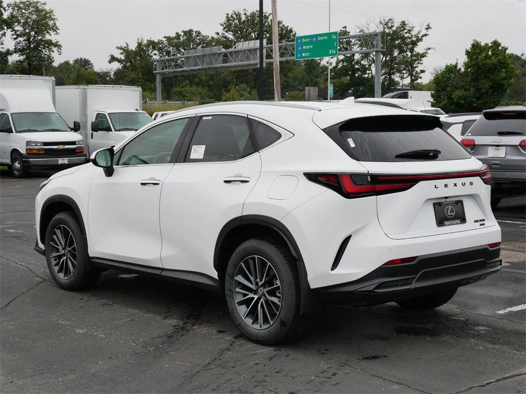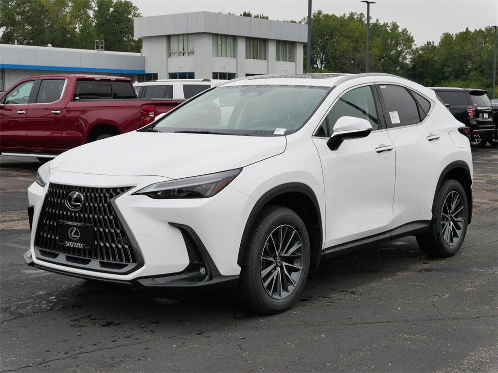 This NX is well equipped with Accessory Package (2T) (All-Weather Cargo Mat and All-Weather Floor Liners), Cold Area Package (Heated Steering Wheel), 10 Speakers, 4-Wheel Disc Brakes, ABS brakes, Air Conditioning, Alloy Wheel Locks w/Triple Nickel Chrome Plating, Alloy wheels, AM/FM radio: SiriusXM, Auto High-beam Headlights, Auto-dimming door mirrors, Auto-dimming Rear-View mirror, Automatic temperature control, Black Emblem Overlays, Brake assist, Bumpers: body-color, Cargo Net, Delay-off headlights, Door Edge Film by 3M, Driver door bin, Driver vanity mirror, Dual front impact airbags, Dual front side impact airbags, Electronic Stability Control, Emergency communication system: Safety Connect (up to 10-year trial subscription included), Exterior Parking Camera Rear, Four wheel independent suspension, Front anti-roll bar, Front Bucket Seats, Front Center Armrest, Front dual zone A/C, Front fog lights, Front reading lights, Fully automatic headlights, Garage door transmitter: HomeLink, Heated door mirrors, Heated Front Seats, Heated front seats, Illuminated Door Sills w/Lexus Logo, Illuminated entry, Key Gloves w/Embossed Lexus Logo, Knee airbag, Leather Shift Knob, Leather steering wheel, Lexus Interface w/9.8 Touchscreen Display, Low tire pressure warning, Mudguards, Navigation system: Drive Connect Cloud Navigation (subscription required), NuLuxe Seat Trim, Occupant sensing airbag, Outside temperature display, Overhead airbag, Overhead console, Panic alarm, Passenger door bin, Passenger vanity mirror, Power door mirrors, Power driver seat, Power Liftgate, Power Moonroof, Power passenger seat, Power steering, Power windows, Premium Paint (PJ), Radio data system, Radio: 10-Speaker Lexus Premium Sound System, Rain sensing wipers, Rear anti-roll bar, Rear reading lights, Rear seat center armrest, Rear window defroster, Rear window wiper, Remote keyless entry, Security system, Speed control, Speed-sensing steering, Speed-Sensitive Wipers, Split folding rear seat, Spoiler, Steering wheel mounted audio controls, Tachometer, Telescoping steering wheel, Tilt steering wheel, Traction control, Trip computer, Turn signal indicator mirrors, Variably intermittent wipers, Wheels: 18 15-Spoke Alloy, Wireless Apple CarPlay/Wireless Android Auto, and Wireless Phone Charger.
