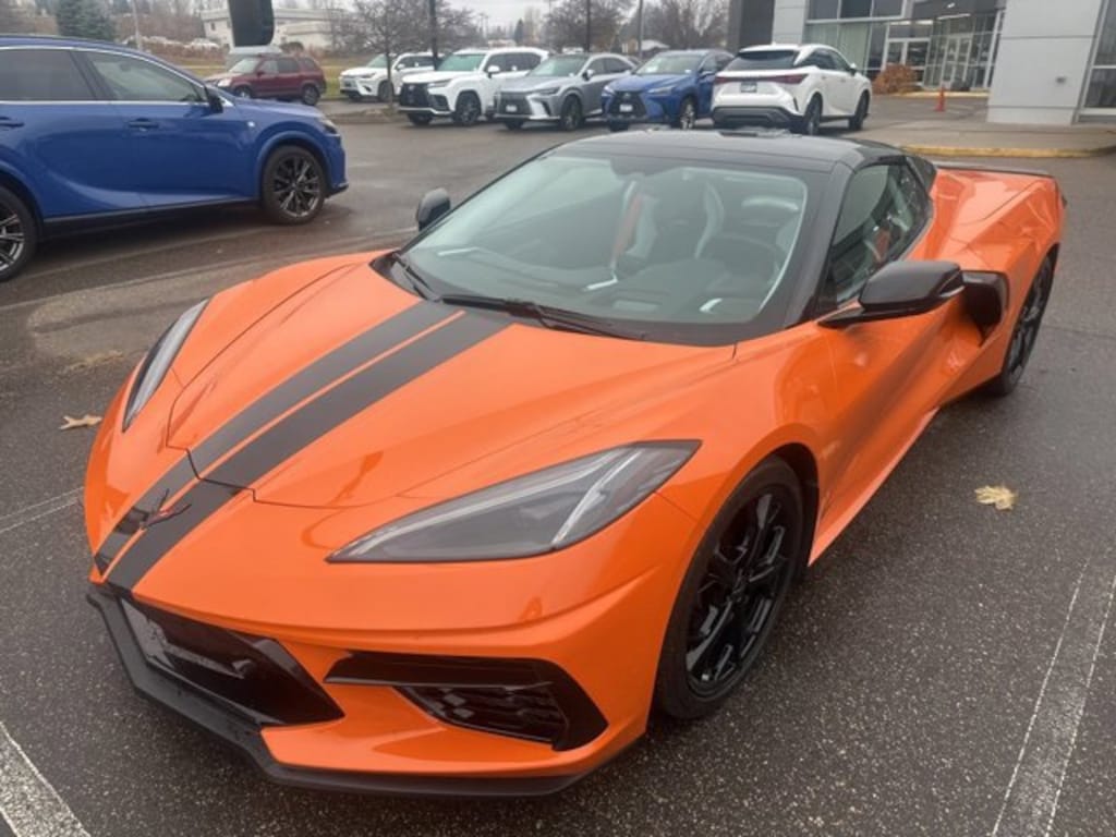 This Corvette is well equipped with Carbon Flash Metallic Painted Outside Mirrors (Carbon Flash Metallic-Painted Outside Mirrors), Custom Leather Wrapped Interior Package, Memory Driver & Passenger Convenience Package, Preferred Equipment Group 3LT (2 Cargo Nets, Driver Power Bolster Seat Adjuster, Electrical Theft Deterrent System, HD Front & Rear Vision Cameras, Head-Up Display, Heated & Vented Driver & Passenger Seats, Heated Steering Wheel, Passenger Power Bolster Seat Adjuster, Performance Data & Video Recorder, Power Driver Lumbar Control Seat Adjuster, Power Passenger Lumbar Control Seat Adjuster, Power-Adjustable Outside Heated Mirrors, Rear Cross Traffic Alert, Side Blind Zone Alert, Sueded Microfiber-Wrapped Upper Interior Trim Pkg, Universal Home Remote, Vehicle Inclination Theft Deterrent Sensor, Vehicle Interior Movement Theft Deterrent Sensor, and Wireless Charging for Devices), 14 Speakers, 2-Tone Seats, 4-Wheel Disc Brakes, 8-Way Power Driver Seat Adjuster, 8-Way Power Passenger Seat Adjuster, ABS brakes, Air Conditioning, Alloy wheels, AM/FM radio: SiriusXM, Apple CarPlay/Android Auto, Auto-dimming door mirrors, Auto-dimming Rear-View mirror, Automatic temperature control, Black Custom Splash Guards (LPO), Black Exhaust Tips, Bose Performance Series Sound System w/14 Speakers, Brake assist, Bumpers: body-color, Carbon Fiber Interior Trim, Carbon Flash Metallic Dual Racing Stripes, Compass, Convertible HardTop, Convertible roof lining, Convertible Top w/Carbon Flash Nacelles & Roof, Delay-off headlights, Driver door bin, Driver vanity mirror, Dual front impact airbags, Dual front side impact airbags, Electronic Stability Control, Emergency communication system: OnStar and Chevrolet connected services capable, Four wheel independent suspension, Front anti-roll bar, Front Bucket Seats, Front Center Armrest, Front dual zone A/C, Front reading lights, Fully automatic headlights, Garage door transmitter, Glass rear window, GT2 Bucket Seats, HD Radio, Heads-Up Display, Heated door mirrors, Heated front seats, Heated steering wheel, Illuminated entry, Integrated roll-over protection, Leather Shift Knob, Leather steering wheel, Low tire pressure warning, Low-Profile Rear Spoiler & Front Splitter, Magnetic Selective Ride Control Suspension, Memory seat, Napa Lthr Seating Surfaces w/Perforated Inserts, Navigation System, Occupant sensing airbag, Orange Seat Belt Color, Outside temperature display, Overhead console, Panic alarm, Passenger door bin, Passenger vanity mirror, Performance Exhaust w/Stainless-Steel Tips, Power convertible roof, Power door mirrors, Power driver seat, Power passenger seat, Power steering, Power windows, Premium audio system: Chevrolet Infotainment 3 Premium, Radio data system, Radio: Chevrolet Infotainment 3 Premium System, Rear anti-roll bar, Rear window defroster, Remote keyless entry, Security system, SiriusXM Radio, Speed control, Speed-sensing steering, Sport steering wheel, Steering wheel memory, Steering wheel mounted audio controls, Tachometer, Telescoping steering wheel, Tilt steering wheel, Traction control, Trip computer, Turn signal indicator mirrors, Variably intermittent wipers, Ventilated front seats, Voltmeter, and Wheels: 19 x 8.5 Fr/20 x 11 Rr Bright Silver.