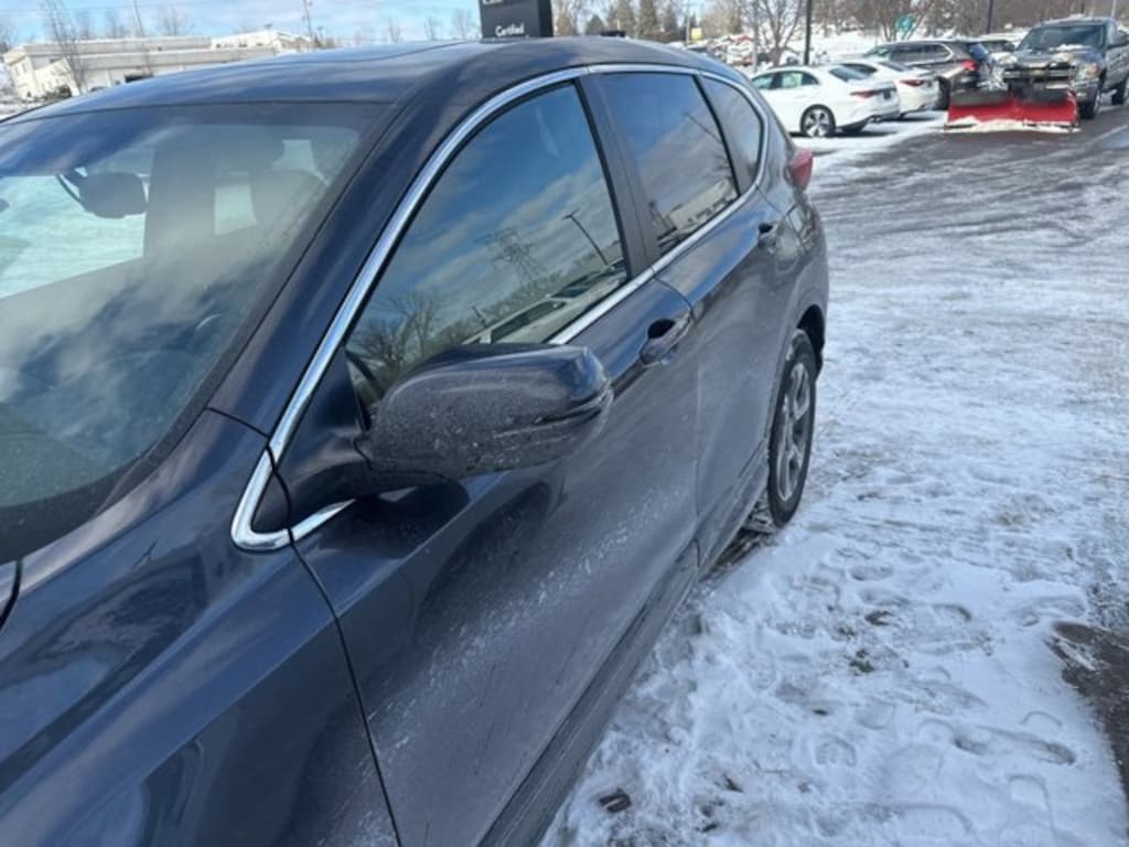 This CR-V is well equipped with AWD, 18 Alloy Wheels, 4-Wheel Disc Brakes, 5.64 Axle Ratio, 8 Speakers, ABS brakes, Air Conditioning, Alloy wheels, AM/FM radio: SiriusXM, Apple CarPlay/Android Auto, Auto High-beam Headlights, Auto-dimming Rear-View mirror, Automatic temperature control, Blind Spot Information (BSI) System warning, Brake assist, Bumpers: body-color, Compass, Delay-off headlights, Driver door bin, Driver vanity mirror, Dual front impact airbags, Dual front side impact airbags, Electronic Stability Control, Exterior Parking Camera Rear, Four wheel independent suspension, Front anti-roll bar, Front Bucket Seats, Front Center Armrest, Front dual zone A/C, Front fog lights, Front reading lights, Fully automatic headlights, Garage door transmitter: HomeLink, Heated door mirrors, Heated Front Bucket Seats, Heated front seats, Illuminated entry, Leather Seat Trim, Leather Shift Knob, Low tire pressure warning, Memory seat, Occupant sensing airbag, Outside temperature display, Overhead airbag, Overhead console, Panic alarm, Passenger door bin, Passenger vanity mirror, Power door mirrors, Power driver seat, Power Liftgate, Power moonroof, Power passenger seat, Power steering, Power windows, Radio data system, Radio: AM/FM/HD/SiriusXM Audio System, Rear anti-roll bar, Rear seat center armrest, Rear window defroster, Rear window wiper, Remote keyless entry, Security system, Speed control, Speed-sensing steering, Speed-Sensitive Wipers, Split folding rear seat, Spoiler, Steering wheel mounted audio controls, Tachometer, Telescoping steering wheel, Tilt steering wheel, Traction control, Trip computer, Turn signal indicator mirrors, and Variably intermittent wipers.