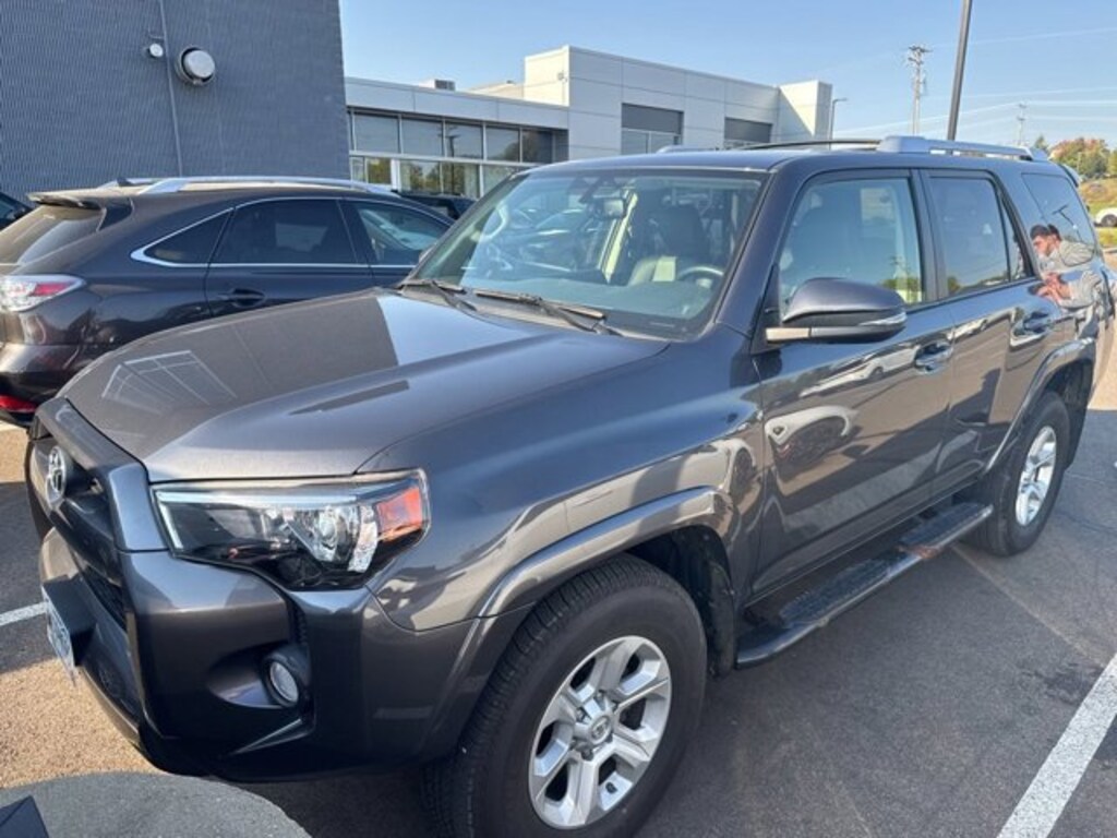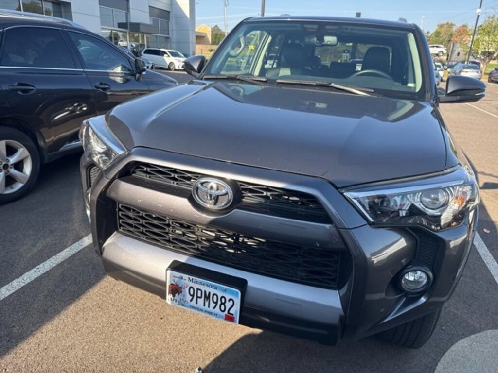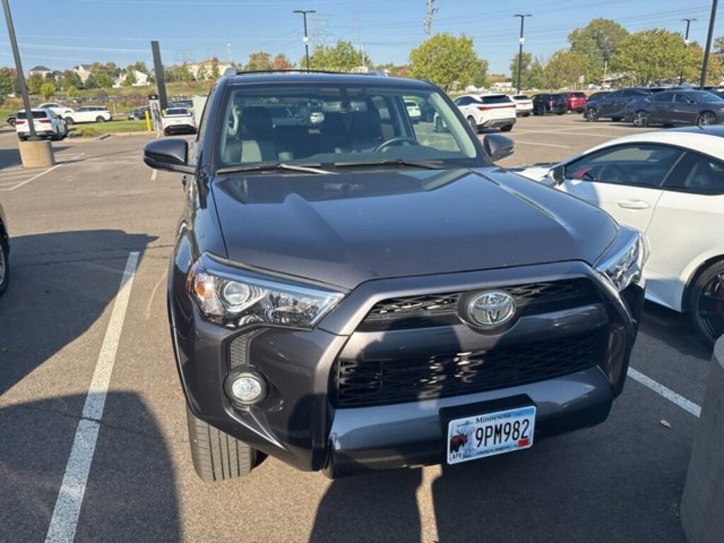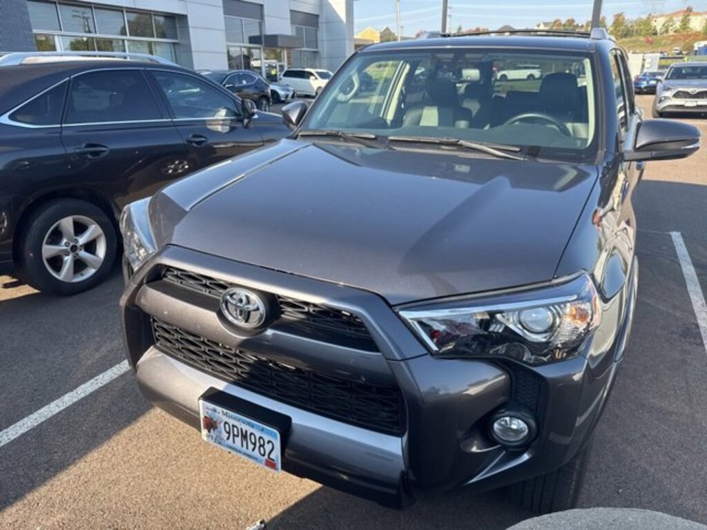 This 4Runner is well equipped with 4WD, Black w/Leather Seat Trim, 17 x 7.0 6-Spoke Alloy Wheels, 3.727 Axle Ratio, 4-Wheel Disc Brakes, 8 Speakers, ABS brakes, Air Conditioning, Alloy wheels, AM/FM radio: SiriusXM, Anti-whiplash front head restraints, Auto-Dimming Rear-View Mirror, Auto-dimming Rear-View mirror, Body Color Heated Mirrors, Brake assist, Bumpers: body-color, CD player, Compass, Driver door bin, Driver vanity mirror, Dual front impact airbags, Dual front side impact airbags, Electronic Stability Control, Exterior Parking Camera Rear, Front anti-roll bar, Front Bucket Seats, Front Center Armrest, Front fog lights, Front reading lights, Front wheel independent suspension, Garage Door Opener, Garage door transmitter: HomeLink, Heated door mirrors, Heated Front Bucket Seats, Heated front seats, Illuminated entry, Knee airbag, Leather Shift Knob, Leather steering wheel, Low tire pressure warning, Navigation System, Occupant sensing airbag, Outside temperature display, Overhead airbag, Overhead console, Panic alarm, Passenger door bin, Passenger vanity mirror, Power door mirrors, Power driver seat, Power moonroof, Power passenger seat, Power steering, Power Tilt & Slide Moonroof w/Sunshade, Power windows, Radio: Entune Premium Audio w/Navigation, Rear anti-roll bar, Rear seat center armrest, Rear window defroster, Rear window wiper, Remote keyless entry, Roof rack: rails only, Security system, Softex Synthetic Leather Seat Trim, Speed control, Speed-sensing steering, Split folding rear seat, Spoiler, Steering wheel mounted audio controls, Tachometer, Telescoping steering wheel, Tilt steering wheel, Traction control, Trip computer, Turn signal indicator mirrors, Variably intermittent wipers, and Voltmeter.